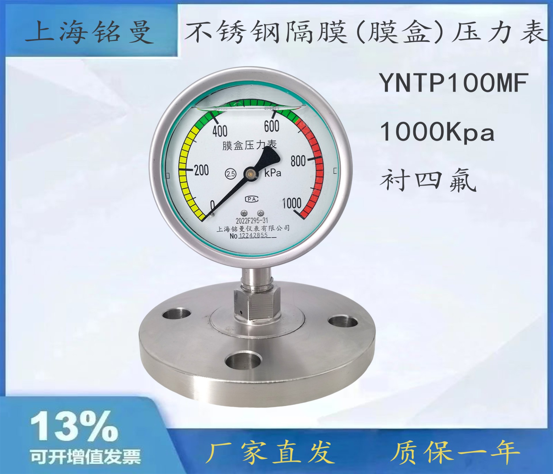 銘曼 耐震隔膜壓力表YNTP150BF,DN25法蘭?四氟,-0.1~0.9mpa ...